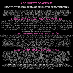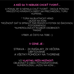 zahŕňa ubytovanie, stravovanie (2 x raňajky, 2 x večera), všetky pomôcky na tvorenie